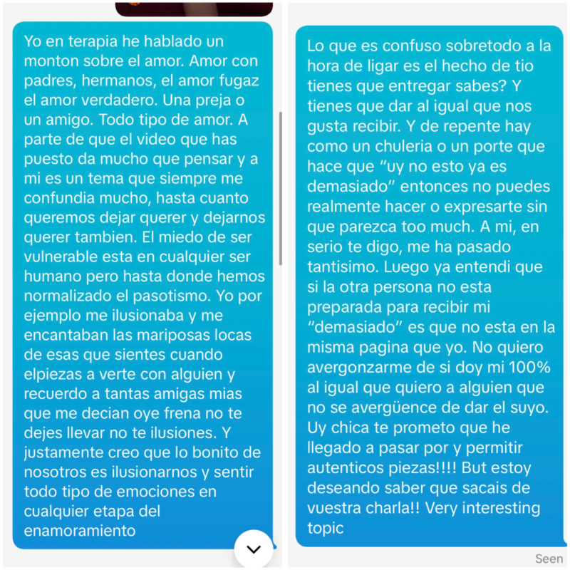 Si algo tenéis que saber sobre mí es que yo no soy de ver un vídeo, deslizar y pasar al siguiente. Yo leo, pienso, comento, escribo, mando mensajes. Me gusta que se me escuche. Es curioso, porque en persona muchas veces no me gusta alzar la voz - ser demasiado vista me provoca ansiedad -, pero en mi “personaje” escribir, debatir y opinar es casi una necesidad vital.